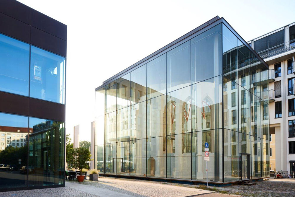 Là où se dressait autrefois la Sophienkirche, le plan pavé nous rappelle aujourd'hui sa destruction. Cinq piliers abstraits surgissent de nulle part comme des mémoriaux. Ils ont été érigés à l'endroit où les cinq contreforts sud soutenaient autrefois l'église à deux nefs de la salle. La structure de l'ancienne voûte à nervures croisées est reproduite par des profilés métalliques. Au sous-sol se trouve la « Salle du Silence », dans laquelle sont exposées deux grandes pierres de la fondation de la Sophienkirche, 12 pierres tombales du 17e siècle et des pierres plaquées de l'intérieur de l'église. Une coquille de verre d'une hauteur de 13,5 m et d'une surface de base de 22 m x 12 m entoure le mémorial commémoratif.